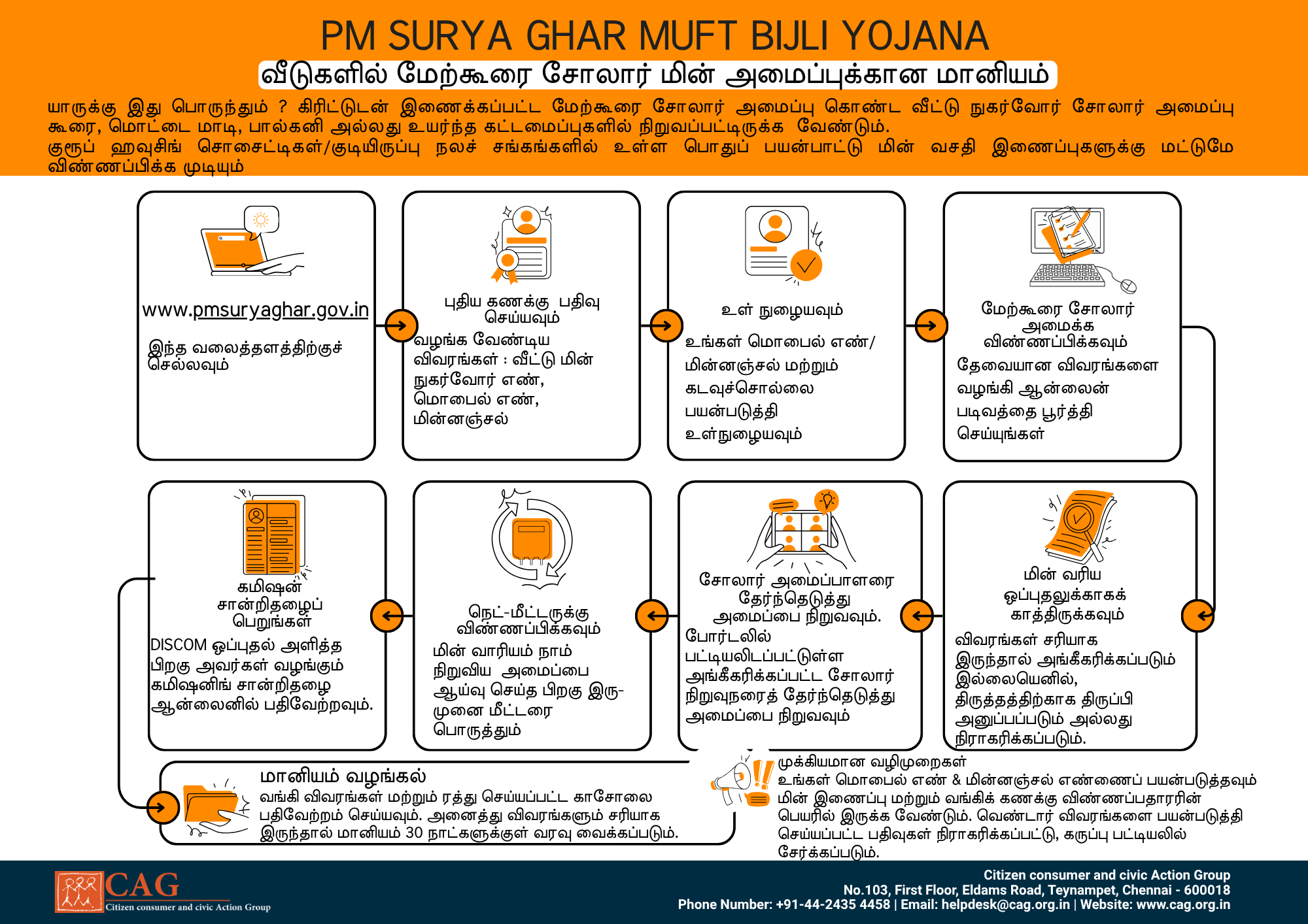 CAG has initiated this project to promote rooftop solar (RTS) adoption in selected districts of Tamil Nadu, namely Madurai, Karur, Dindigul, Salem, Namakkal, Thiruvarur, and Thanjavur. It aligns with India's sustainability goals by enhancing energy security, reducing carbon emissions, and fostering economic growth. The PM Surya Ghar Muft Bijli Yojana, launched in February 2024, subsidises RTS installations for one crore households. This initiative empowers rural and low-income urban communities to achieve energy self-reliance, decreasing fossil fuel dependence and promoting environmental sustainability.