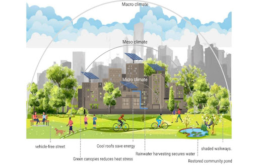 - Meso-climate (Neighbourhood scale): Urban features like street orientation, green cover, water bodies, and open spaces influence how neighbourhoods experience climate. Tree-lined streets help reduce urban heat, while restored ponds and wetlands can prevent flooding during heavy rains. Community events, workshops, or public art installations that explain these benefits help residents connect everyday spaces with climate resilience.