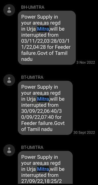 Tamil Nadu Generation and Distribution Corporation Limited (TANGEDCO) sends SMS alerts to registered mobile numbers to inform them of any planned outages/shutdowns in the neighbourhood. To do this, TANGEDCO first updates details of the outage on Urja Mitra - the union government’s portal for power outage information dissemination, which then automatically sends out the SMS to consumers.