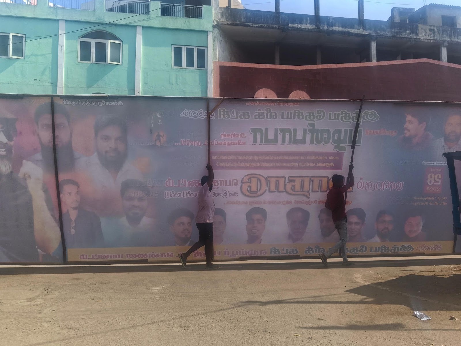 தூரத்தில் பழைய சினிமா பாடல்கள் ஒலிபெருக்கியில் ஒலித்துக் கொண்டு இருந்தது; வீடுகளை மறைக்கும் அளவிற்கு பெரிய பெரிய பிளெக்ஸ் பேனர்கள் வரிசையாக வாசங்கங்களை சுமந்து நின்றன; கண்ணுக்கு எட்டிய தூரம் வரை வரிசையாக இருக்கைகளை அடுக்கிக் கொண்டு இருந்தார்கள்; நீண்ட இருக்கையின் வரிசைக்கு கடைசியில் ஒரு பெரிய மேடை, அடர்ந்த மின்விளக்குகளால் அலங்கரிக்க பட்டிருந்தது; அந்த மேடையில், கட்சி தலைவரை வாழ்த்தி ஒரு பேனர் - வாழ்த்த வயதில்லை, வணங்குகிறேன்!, என்று.