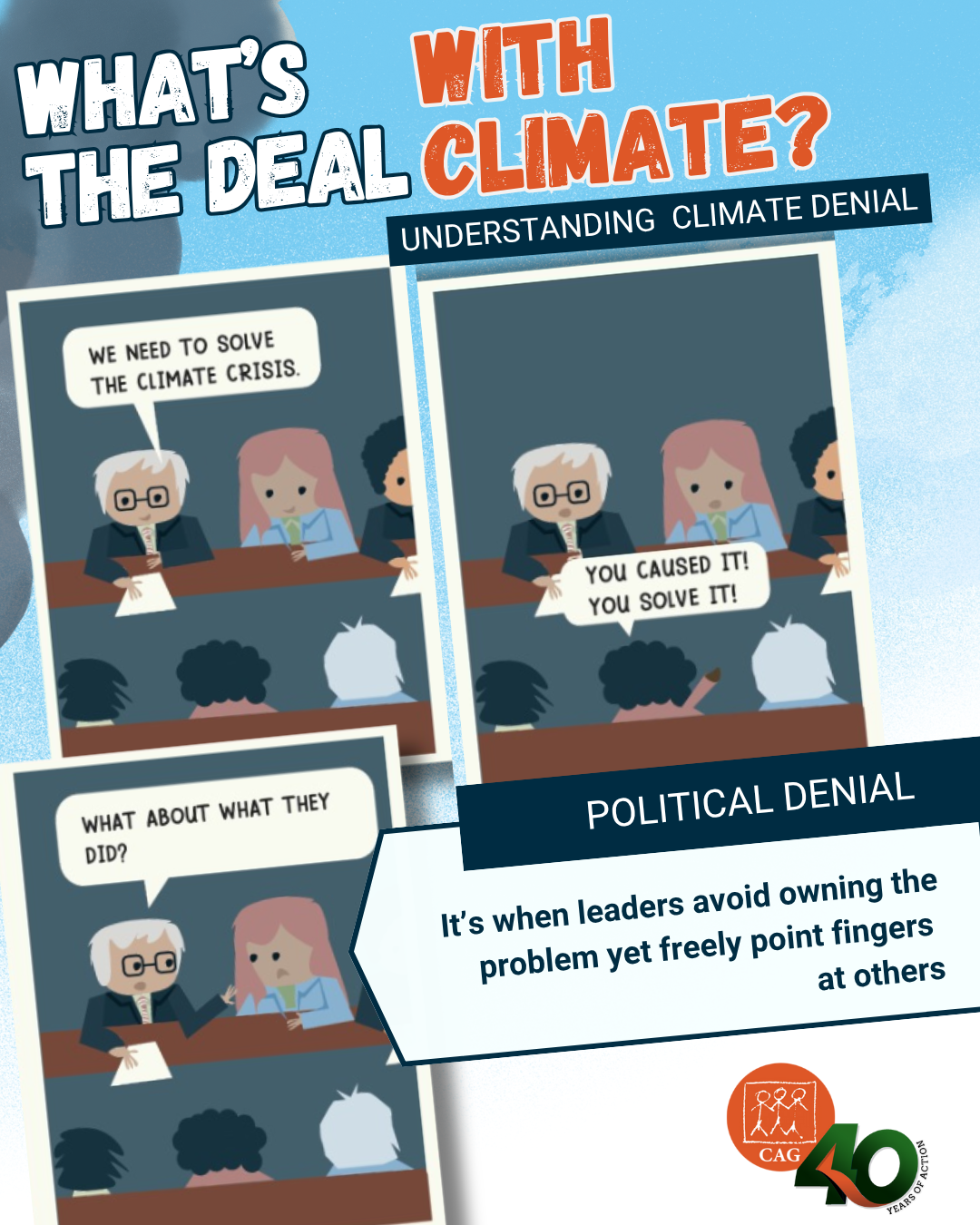 Political climate denial isn’t just about rejecting science, it’s about refusing responsibility. For years, leaders have downplayed the crisis while being quick to blame others for its consequences. This refusal to own the problem has stalled action and shifted the burden onto communities already facing the impacts. When no one in power steps up, the crisis deepens. Political climate denial is ultimately a failure of accountability: no one wants to take responsibility, but everyone is happy to point fingers.