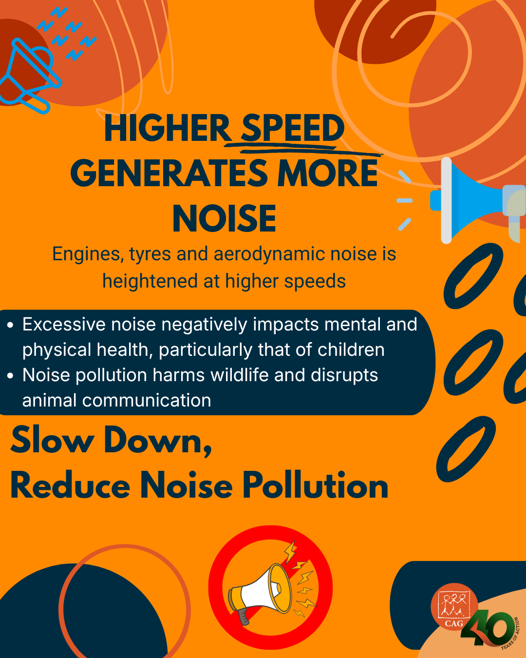 Increased noise pollution is an unseen but much heard consequence of speeding. At higher speeds,your engine and tyres are louder and the aerodynamic noise of your vehicles contributes to noise pollution. An increase in speed by 10 km/hr can increase the noise level by more than 1 decibel for each vehicle passing!