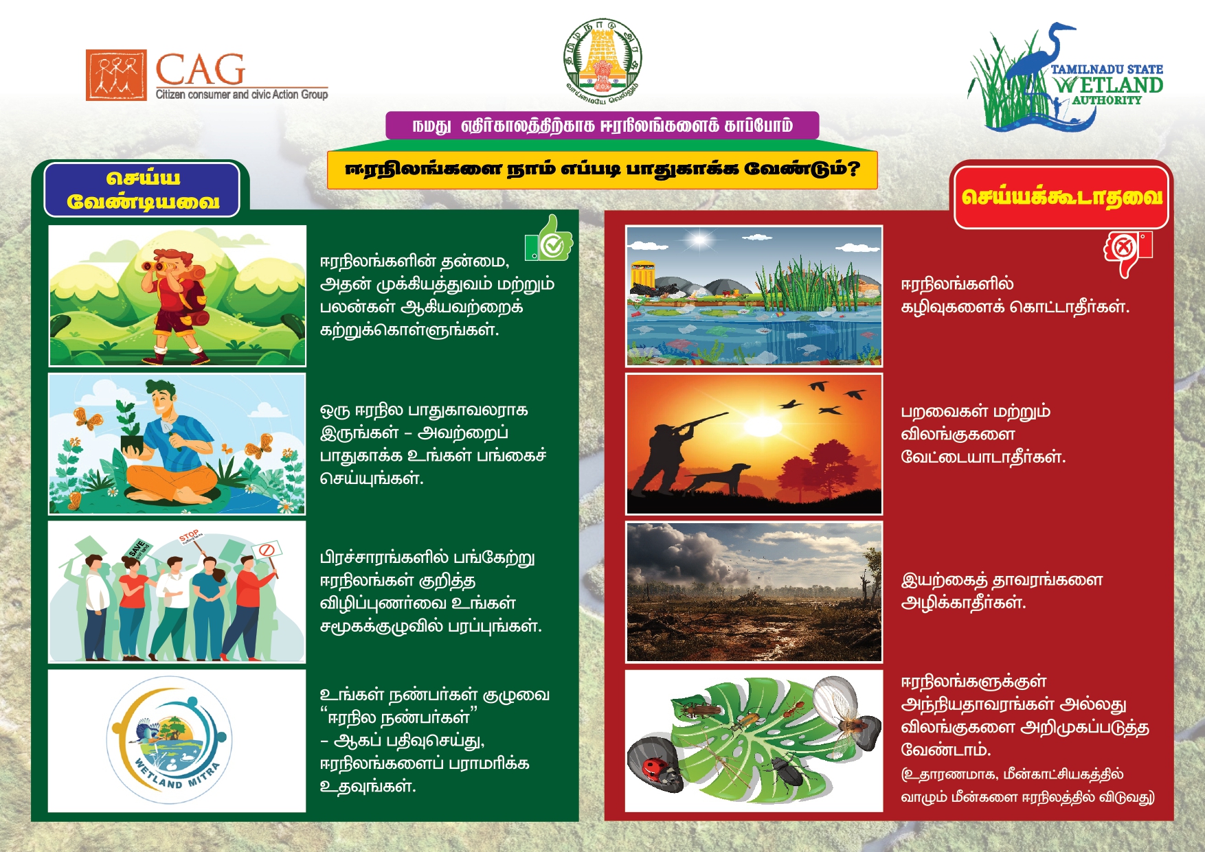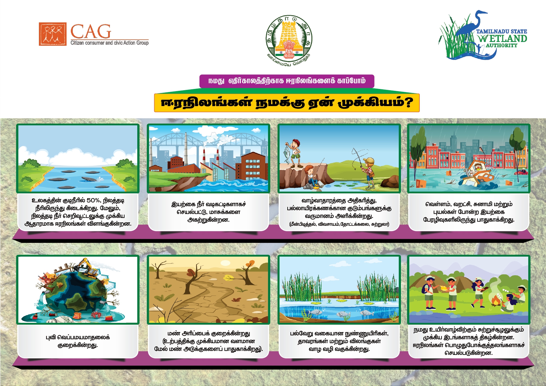 ஈரநிலங்கள் உயிர் வாழ்வைக் காப்பாற்றும், சமூகங்களைப் பாதுகாக்கும், பொருளாதாரத்தை ஆதரிக்கும் உயிர்த்துடிப்பு மிக்க அமைப்புகள். இந்தப் போஸ்டர்கள் ஈரநிலங்கள் எப்படி செயல்படுகின்றன, அவை எதிர்கொள்ளும் அச்சங்கள், அவை வழங்கும் முக்கியமான மதிப்பு ஆகியவற்றை வெளிப்படுத்தி, அவற்றைப் பாதுகாப்பது எங்கள் எதிர்காலத்திற்குத் தவிர்க்க முடியாதது என்பதை உணர்த்துகின்றன.