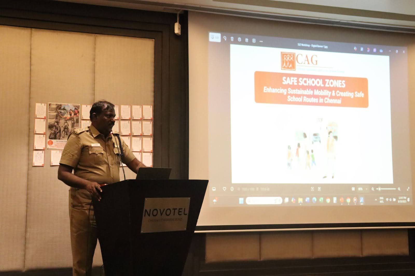 Mr. Bandi Gangadhar, IPS, Joint Commissioner of Police (Traffic), Chennai, delivered the special address, emphasising the urgent need to protect vulnerable road users. He noted that Chennai has recorded 1,000 road crash deaths so far this year, and 35% of these fatalities, that is about 350 lives, are pedestrians. Given that many school children walk to school, he urged that their safety must be prioritised in planning and enforcement. He also shared that the Greater Chennai Traffic Police has identified 25 schools across the city for implementing safety improvements as part of their ongoing initiatives. During the discussion, CAG’s Executive Director, Ms. Saroja, enquired whether the schools covered in CAG’s study and the report’s recommendations could be integrated into this list. Mr. Gangadhar responded positively, expressing openness to considering these schools under the initiative.