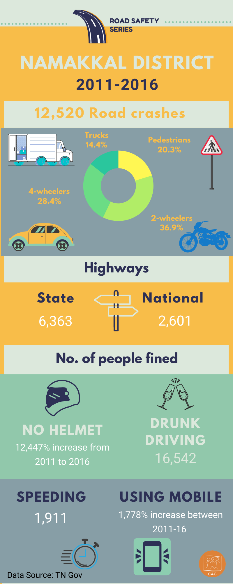 For several years, Tamil Nadu has been faring poorly in road safety, leading other states in fatalities and road crashes or coming close to. However, the data on this is not readily available to the public. The only sources of information are the yearly reports by the Ministry of Road Transport and Highways (MoRTH) and the National Crime Records Bureau (NCRB). These, of course, give only a broad state-level view. So, in 2017, CAG filed RTI (Right to Information) petitions to get district-wise data on crashes, deaths, injuries by road user group for the years 2011 to 2016; information on road safety funds and their usage; and on enforcement of road rules with regards to wearing helmets and seatbelts, drunk driving, and speeding. CAG received partial information from 23 districts, while 9 districts did not respond at all. This is the data received from Namakkal district, distilled into an infograph for you.