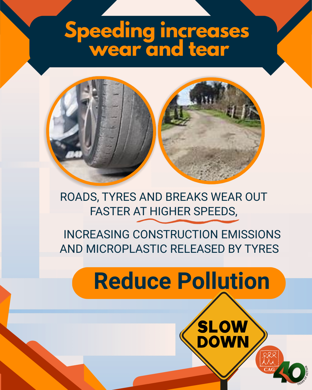 Tyres and roads wear out faster at higher speeds leading to frequent tyre-changes and recurring road construction. Tyre and surface wear also releases more heavy metals and microplastics. These particles don’t just go away, but find their way into our food and water.