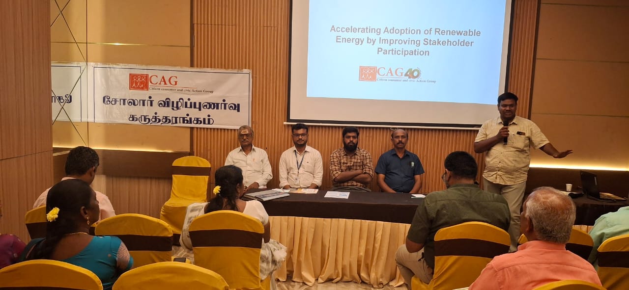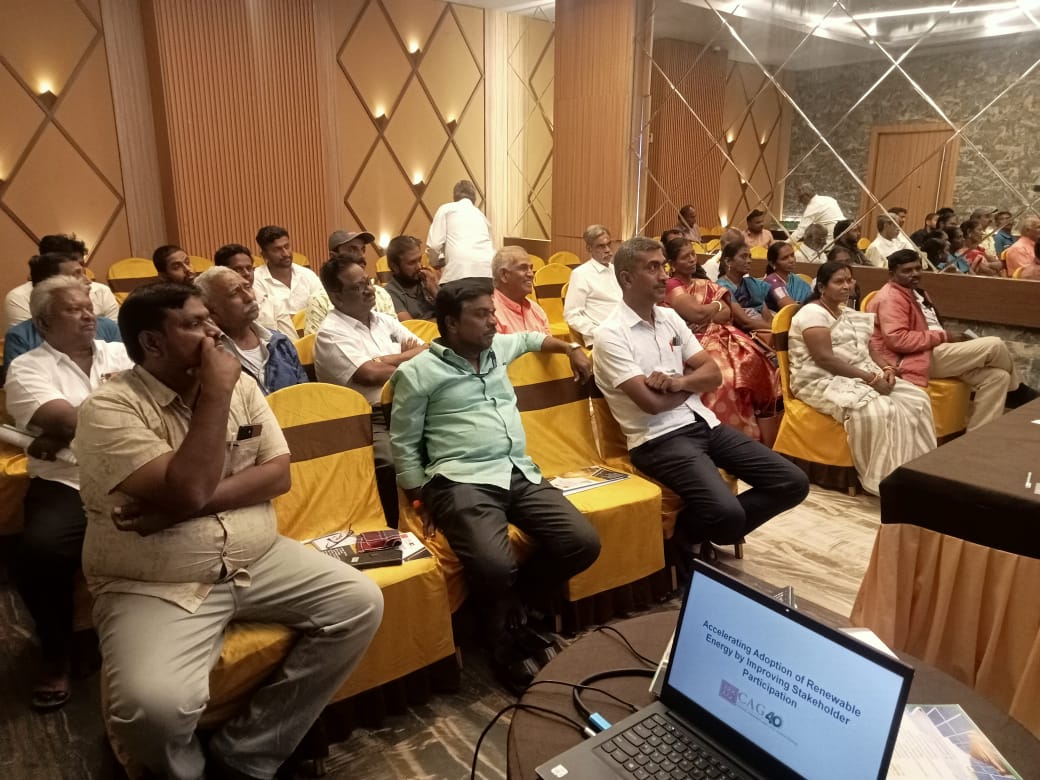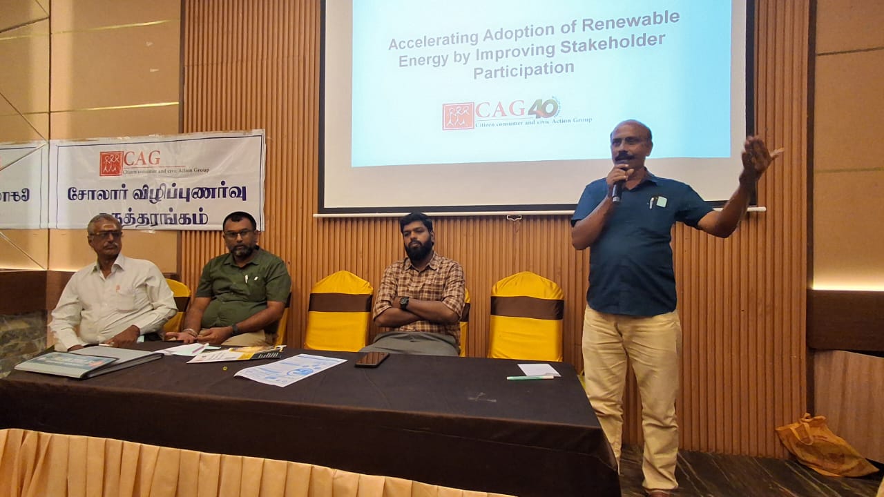 Mr.Bharath Ram, Senior Researcher, CAG presented an overview of CAG’s work and its current initiatives, with a focus on raising awareness about rooftop solar energy. He also explained that this project is being executed in six other districts with the same goal. He stated that the purpose of today’s meeting is to bring all the key stakeholders together to talk about the rooftop solar, subsidy and installation.