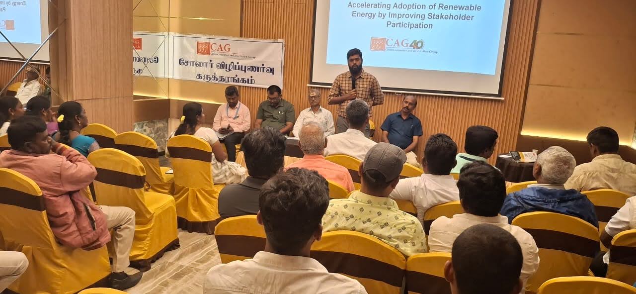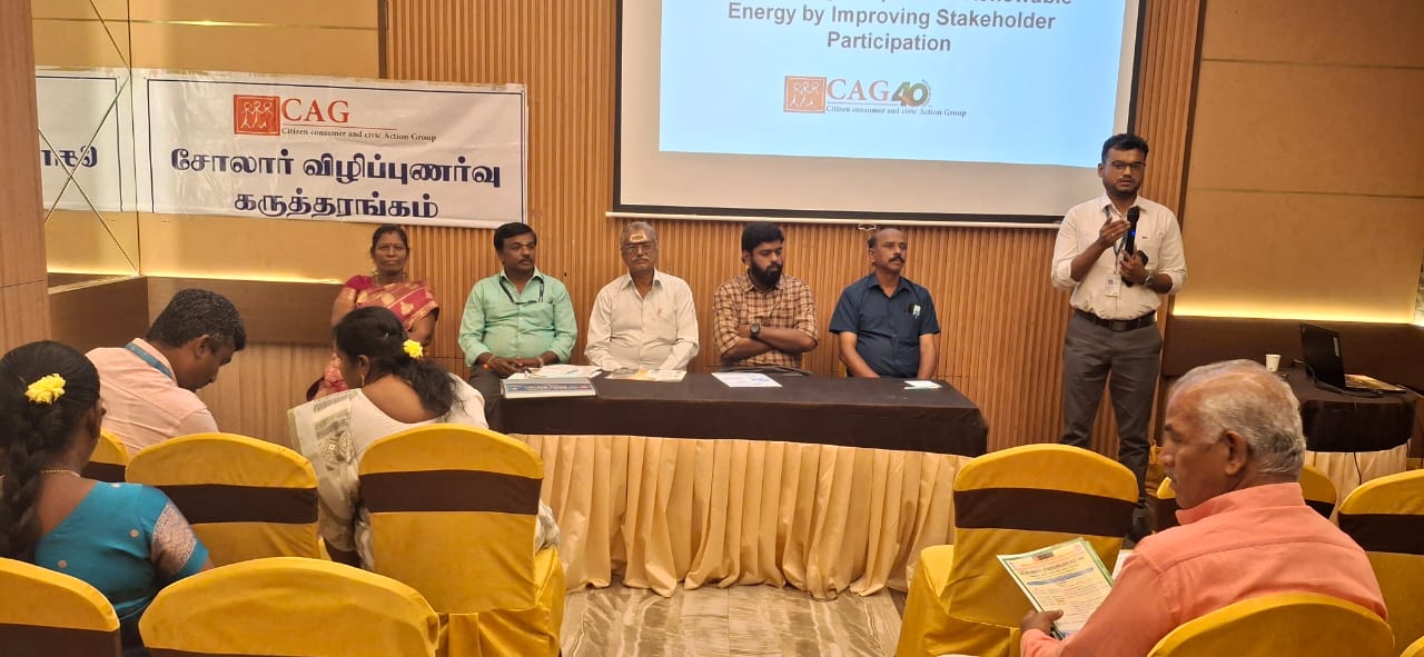 CAG in collaboration with Solar Advisory Unit - Dindigul, organised a stakeholder meeting on the adoption of rooftop solar energy under the PM Surya Ghar Yojana which was held on 29th November 2025 at Hotel Vivera Grande, Dindigul. The primary goal of this meeting was to inform consumers about solar energy, covering topics such as subsidy programs, financing options, and installation processes. Attendees included representatives from solar developers, financial institutions, and media representatives.