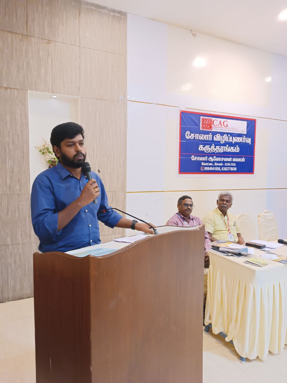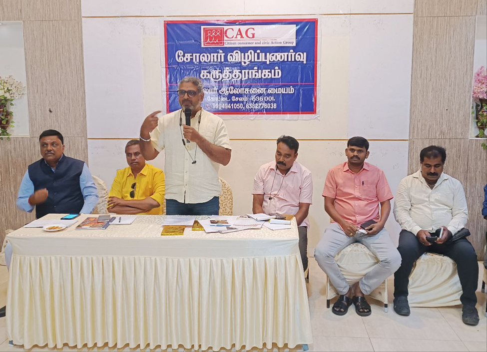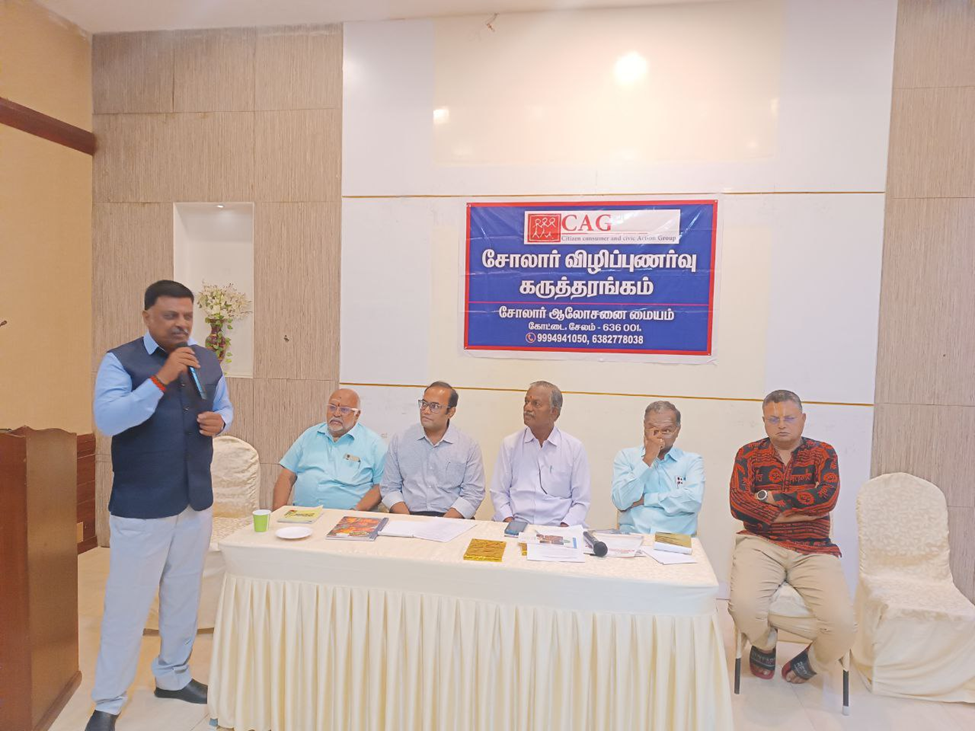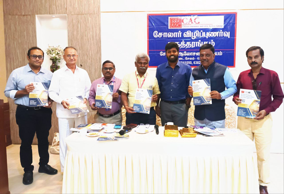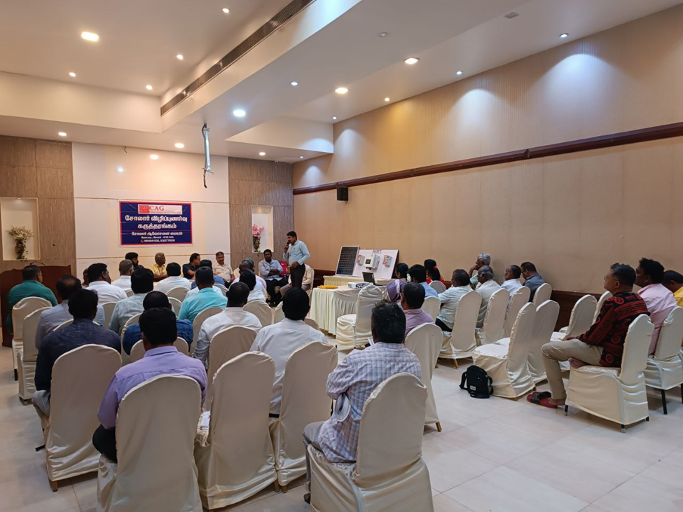 CAG, in collaboration with Solar Advisory Unit - Salem, organised a stakeholder meeting on the adoption of rooftop solar energy under the PM Surya Ghar Yojana. The event was held on 22nd September 2025 at Hotel Kasi’s Inn, Salem. The main objective of the meeting was to raise awareness among consumers about solar energy, including subsidy schemes, loan options, and the procedures for installation. The meeting had participants from solar developers, financial institutions, Tamil Nadu Power Distribution Company Limited officials, and media representatives.