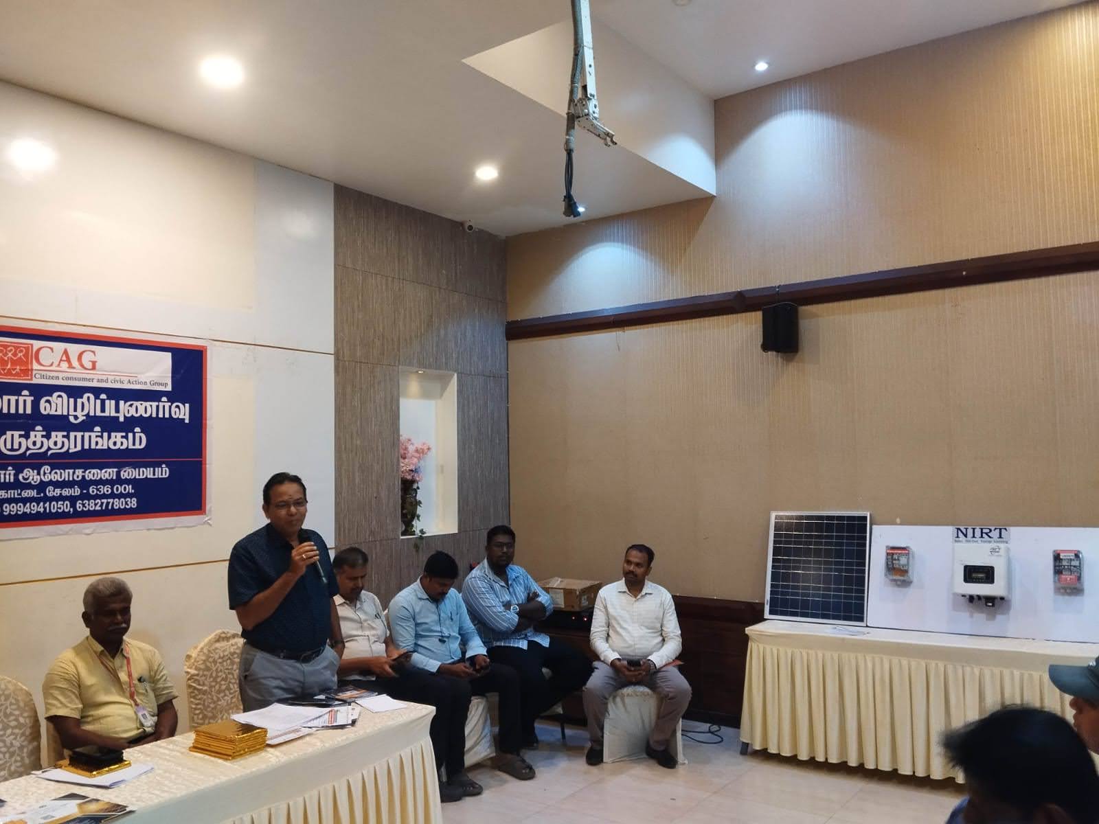 IEC materials were distributed to consumers, financial institutions, and technical experts. The meeting sparked a productive discussion regarding the adoption of solar energy in Tamil Nadu. Representatives from nationalised banks, solar developers, and consumer organisations had the chance to engage with attendees, answering their questions about financing, maintenance, and grid connectivity.