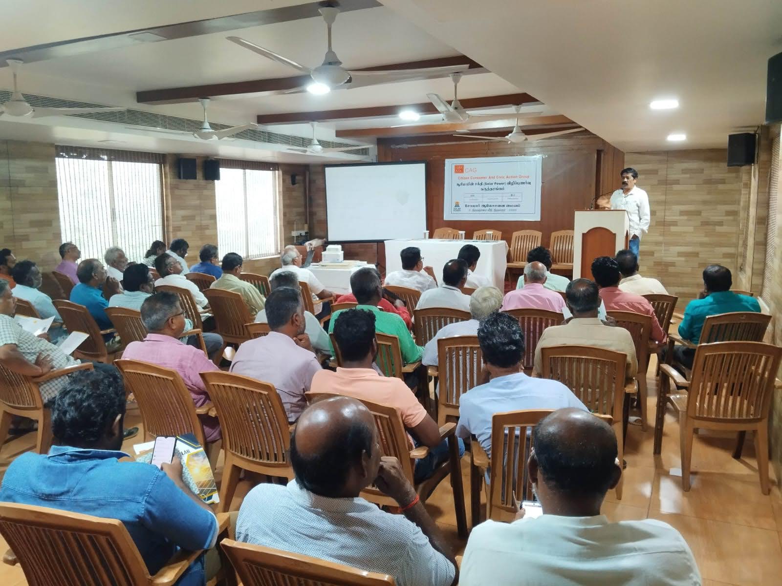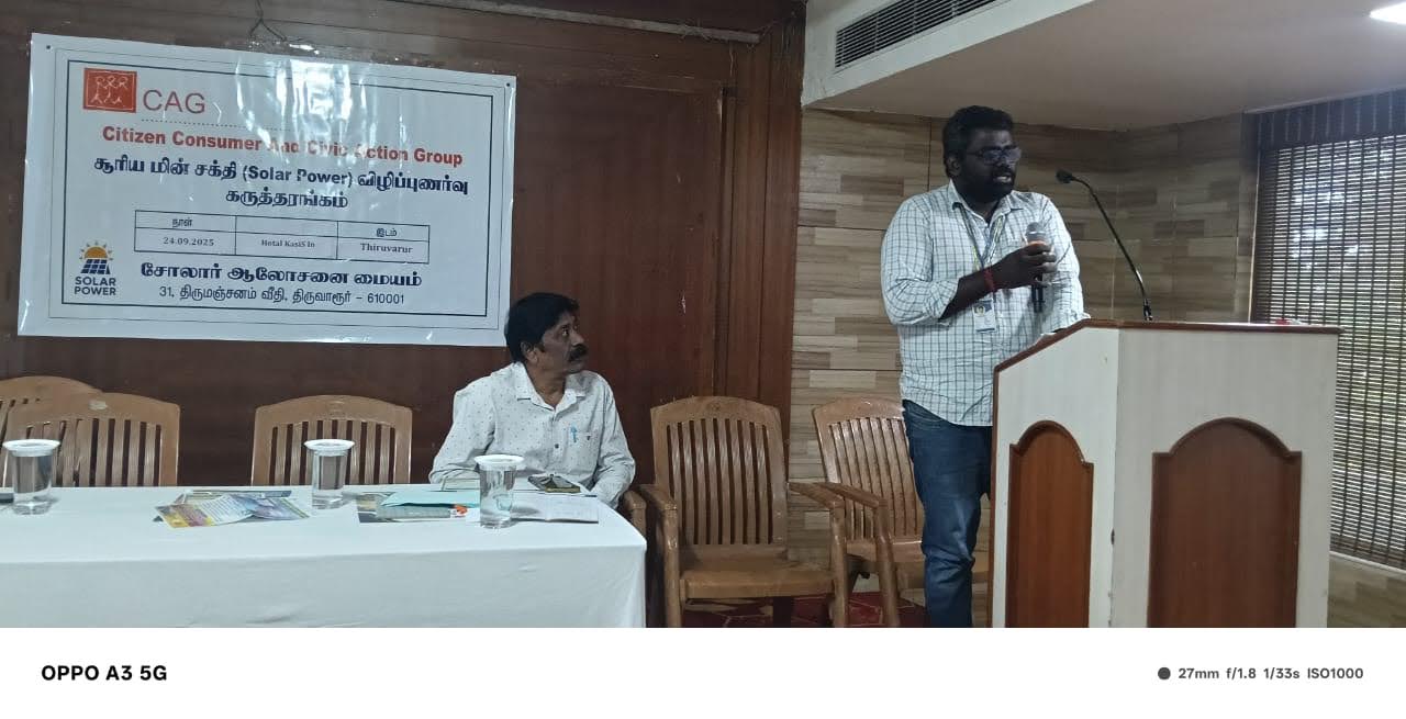 CAG in collaboration with Solar Advisory Unit - Thiruvarur, organised a stakeholder meeting on the adoption of rooftop solar energy under the PM Surya Ghar Yojana which was held on 24th September 2025 at Hotel Kasi’s Inn, Thiruvarur. The main objective of this meeting was to raise awareness among consumers about solar energy, including subsidy schemes, loan options, and the procedures for installation. The meeting had participants from solar developers, financial institutions, Tamil Nadu Power Distribution Company Limited officials, and media representatives.