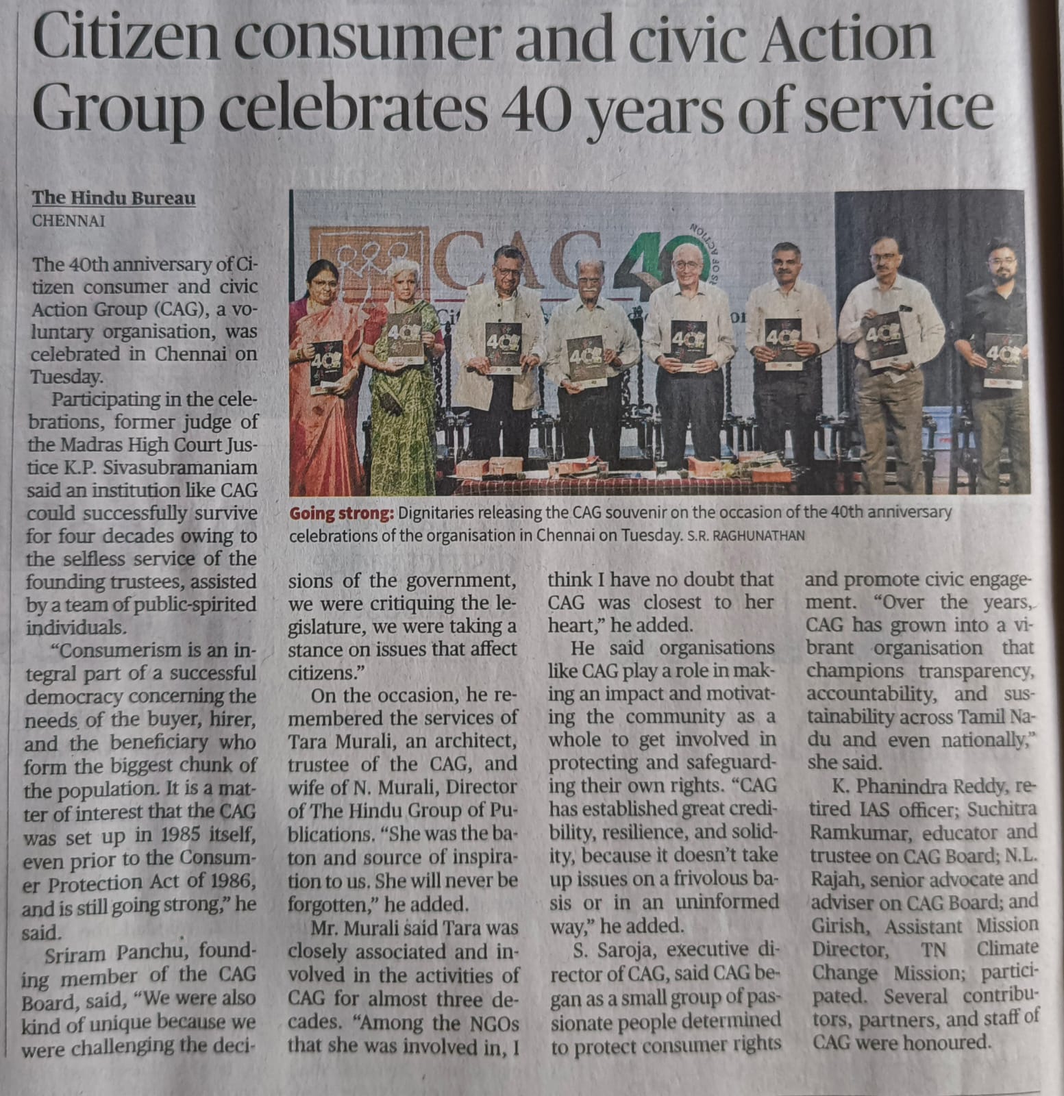 Celebrating 40 years of civic and consumer advocacy, CAG was lauded for its unwavering public service and impact on citizen rights. “We were challenging the decisions of the government taking a stance on issues that affect citizens,” said founding member Mr. Sriram Panchu.