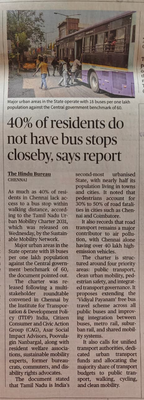 The Tamil Nadu Urban Mobility Charter 2031, which was released by the Sustainable Mobility Network at a multi-stakeholder event organised by CAG with other partners and RWAs calls for urgent investment in public transport, clean urban mobility, pedestrian safety, and integrated transport governance.