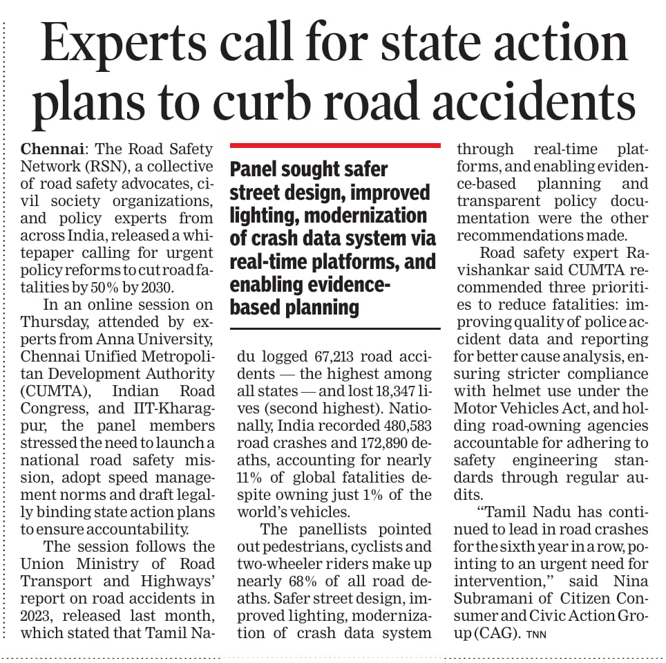 Experts who met to discuss India's road safety crises, urged legally binding State Action Plans and a National Road Safety Mission. Yes again, in 2023, Tamil Nadu recorded the highest number of road accidents, highlighting the need for systemic reform. The event was organised by the Road Safety Network, of which CAG is a partner.