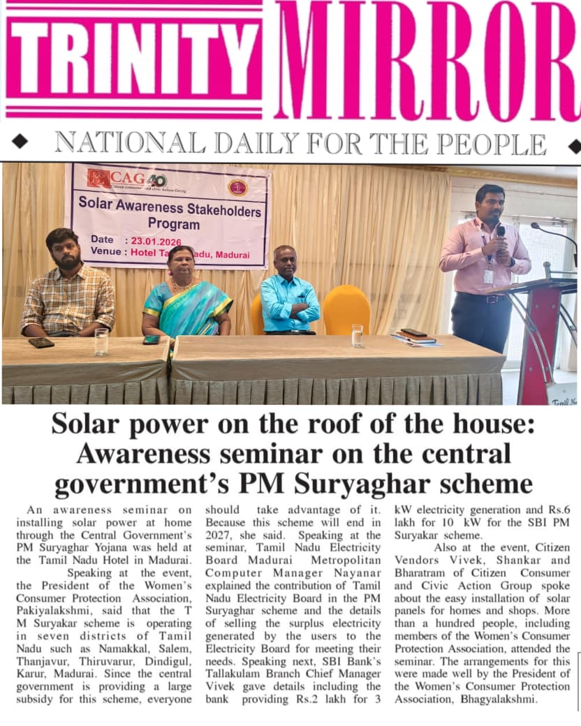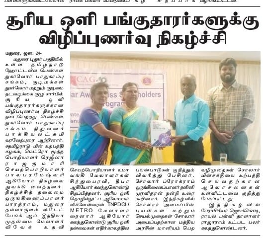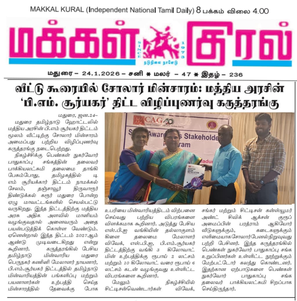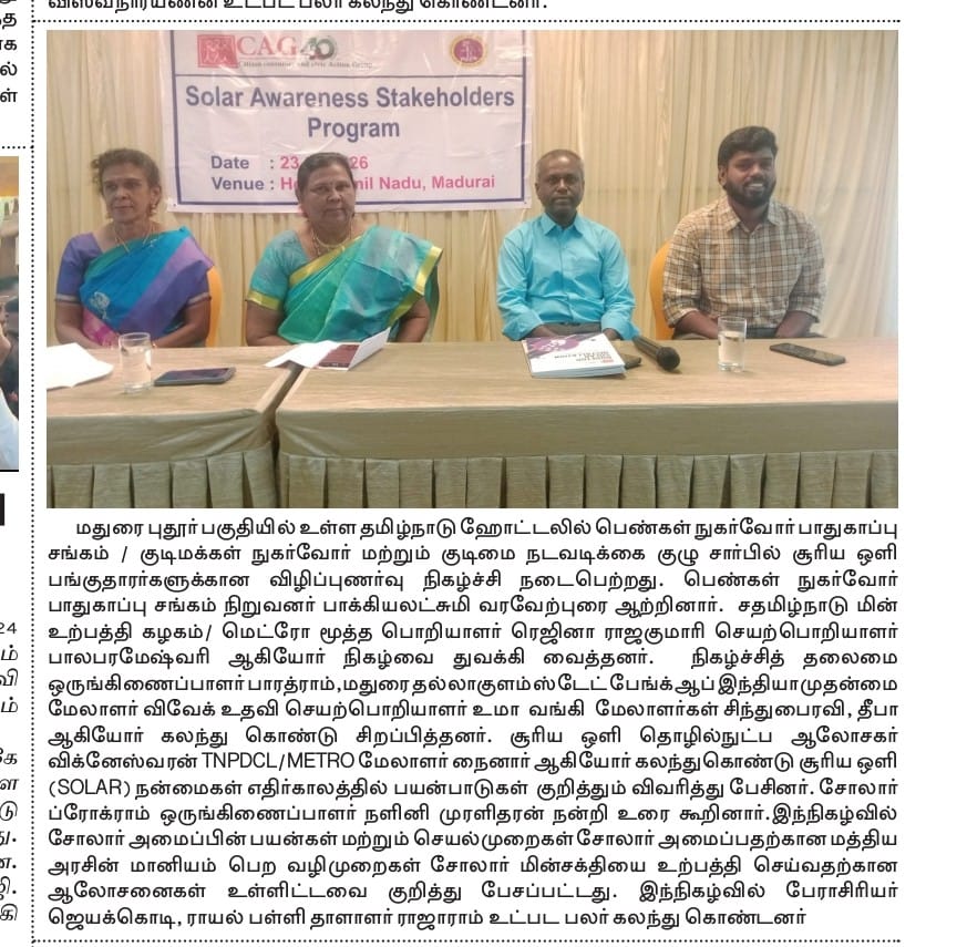 Citizen consumer and civic Action Group conducted a stakeholder workshop on promoting the uptake of RTS in Madurai. In this meeting, the benefits of solar, its usages, rooftop solar for domestic and commercial purposes, government subsidies and loans from financial institutions were discussed.